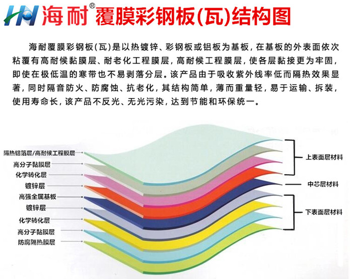 海耐覆膜彩鋼板(咨詢:0510-83326008)可以任意壓型、折彎、沖壓造型,可為建筑設(shè)計(jì)師提供無限創(chuàng)意空間,建造美麗獨(dú)特的建筑外衣、內(nèi)飾、創(chuàng)造完滿的視覺效果。海耐覆膜彩鋼板安全可靠:所有部件均采用鋼性連接,可抗強(qiáng)臺(tái)風(fēng)襲擊。重量輕便:對(duì)鋼構(gòu)的承重要求降低,施工難度小。易安裝:安裝方便,縮短施工周期,節(jié)約工程造價(jià)。隔熱效果高:高熱反射率使產(chǎn)品表面不吸熱,即使在夏天板面也不燙手,使建筑物內(nèi)溫度降6-8度。防腐性強(qiáng):為高污染企業(yè)節(jié)約大量的人力、物力成本。自潔性高:具有抗靜電功能,表面光潔無須經(jīng)常清洗。壽命久遠(yuǎn):表面質(zhì)量可靠,內(nèi)在質(zhì)量始終如一。環(huán)保性強(qiáng):表面凹凸紋使產(chǎn)品不反光,無光污染、消防性好:絕然、絕緣,金屬基板具有A級(jí)阻燃性能。耐候性強(qiáng):在零下-20°C至 60°C的范圍內(nèi)均適用。它以鍍鋅鋼板或鋁板為基板,在基板的外表面可選擇性粘履有鋁箔層、耐老化高分子膜層,外表的耐老化膜層上有壓紋,采用高分子膠合膜粘接,使各層粘接更為牢固,即使在極低溫的寒帶也不易剝落分層。